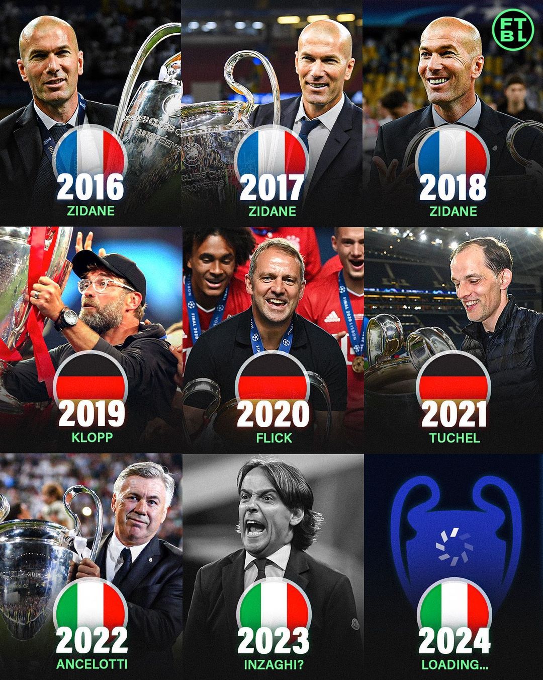 >欧冠玄学🤔法国教练三连,德国教练三连,再到意大利教练三连❓