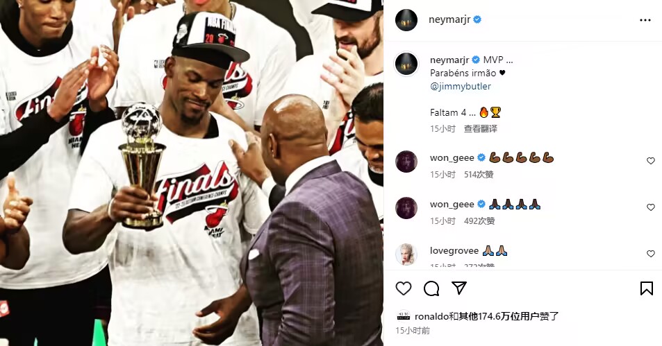 巴特勒荣膺东决MVP,内马尔也在社媒恭喜了巴特勒:MVP!祝贺我的兄弟。