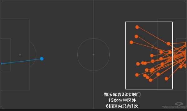 别看上一场半决赛第二回合,坐镇主场的勒沃库森获得了23次射门机会。但其中15次来自禁区外,6码线之内的射门只有1次。