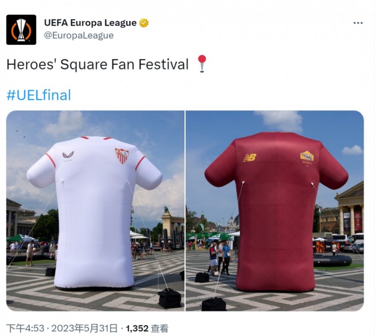 这场决赛将在布达佩斯的普斯卡什球场进行,欧联杯官方账号在社交媒体上晒出布达佩斯英雄广场两队巨大球衣的照片,为此役预热。