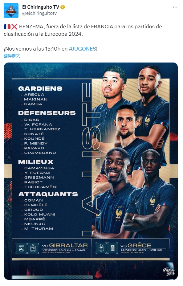 直播吧5月31日讯 今日法国队公布新一期国家队名单,西班牙六台在第一时间跟进,配文称:本泽马被排除出法国队欧预赛名单。