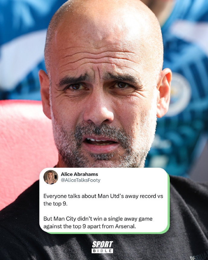 【球迷吐槽】每个人都在说曼联客场对阵top9的糟糕战绩,但曼城在客场对阵top9也就只赢了阿森纳👀