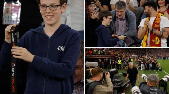 >特别的一个!🎥穆里尼奥将欧联亚军奖牌送给小球迷🥈