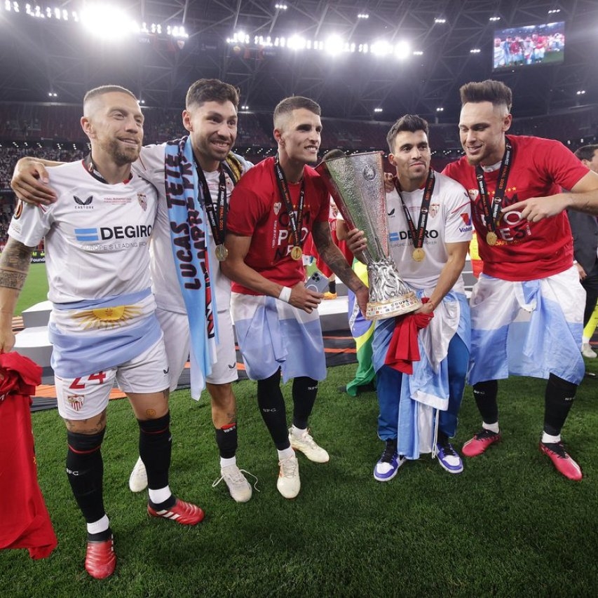 阿根廷小队!戈麦斯蒙铁尔拉梅拉阿库尼亚奥坎波斯与欧联奖杯合影