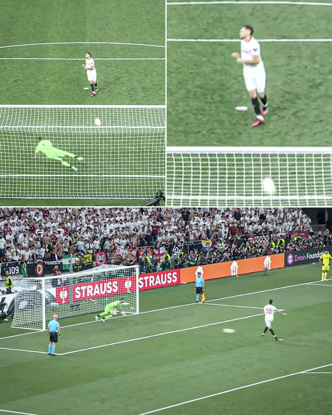 点球大战中,塞维利亚的第一个主罚球员是奥坎波斯,他上演了一次不看人罚点,成功罚进!