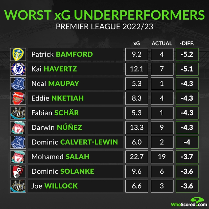 直播吧6月1日讯 WhoScored统计了本赛季英超实际进球和预期进球的最大反差值数据,班福德居首,哈弗茨、萨拉赫上榜。