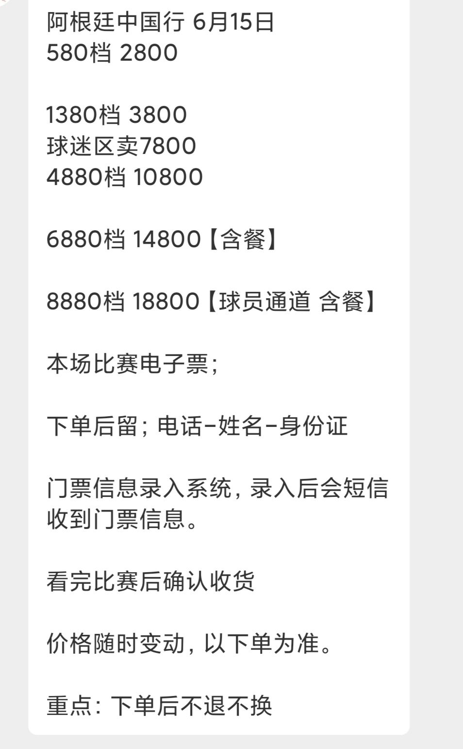 官方消息,阿根廷中国行票务信息公布!分为580元,1380元,2800元,3200元,3800元,4800元共六档票价,将于6月5日13点、6月8日13点分批开票。