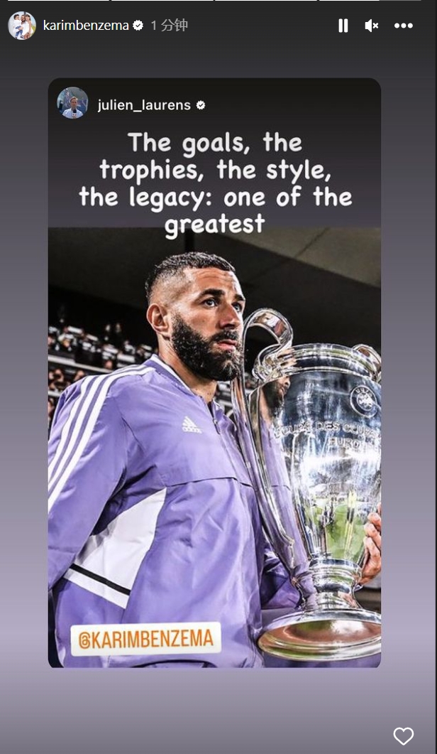 直播吧6月1日讯 本泽马社媒转发了记者Julien Laurens的ins社媒动态:进球!冠军!风格!传承!最佳之一。