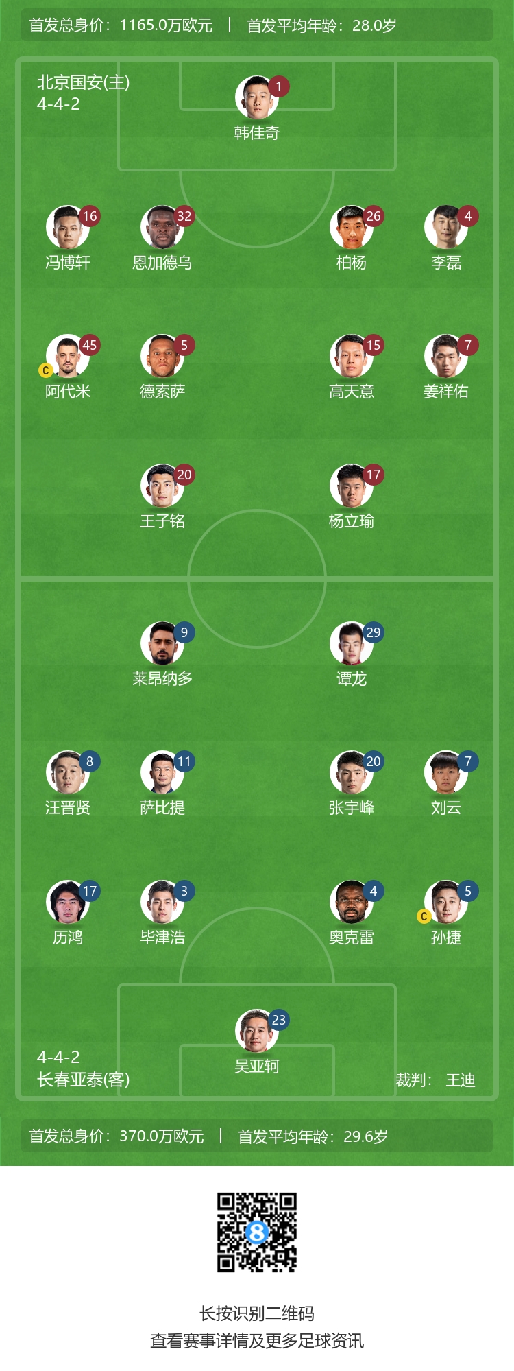 目前中超积分榜上,北京国安3胜5平2负积14分,位列第6;长春亚泰5胜2平3负积17分,位列第5。