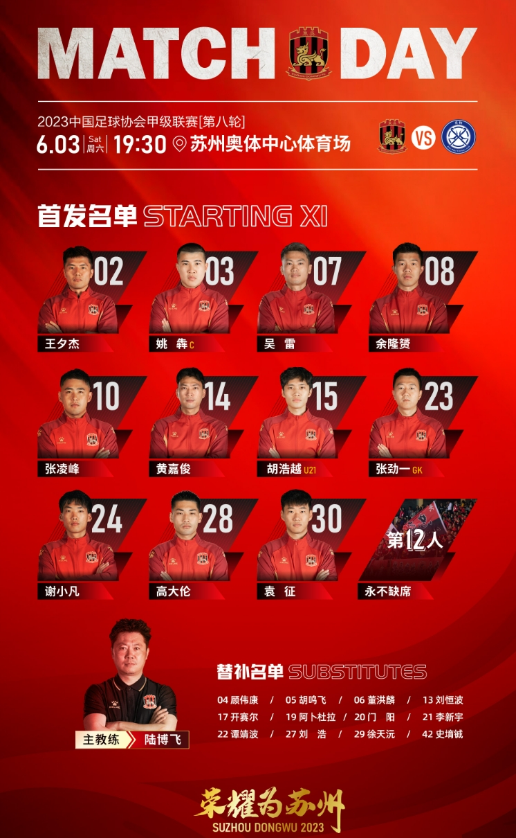 2023中甲联赛第八轮,苏州东吴首发阵容