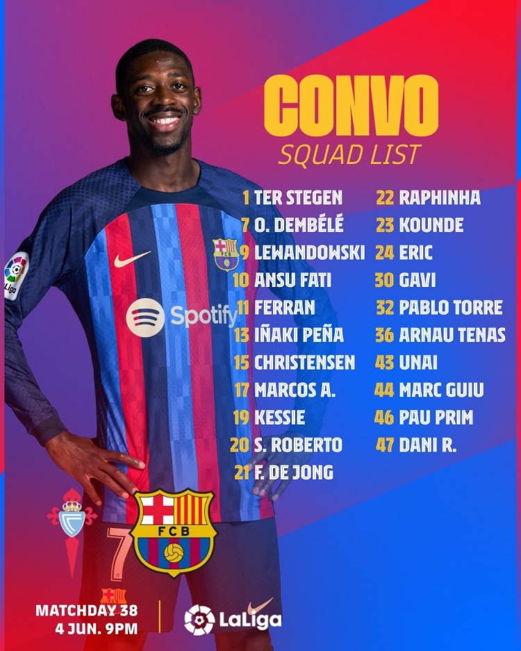 直播吧6月3日讯 北京时间6月5日凌晨,巴萨将在西甲最后一轮比赛中客场对阵塞尔塔,巴萨公布了此役的球员名单,莱万、登贝莱、德容在列,即将离队的阿尔巴、布斯克茨缺席,阿劳霍、佩德里继续因伤缺席。