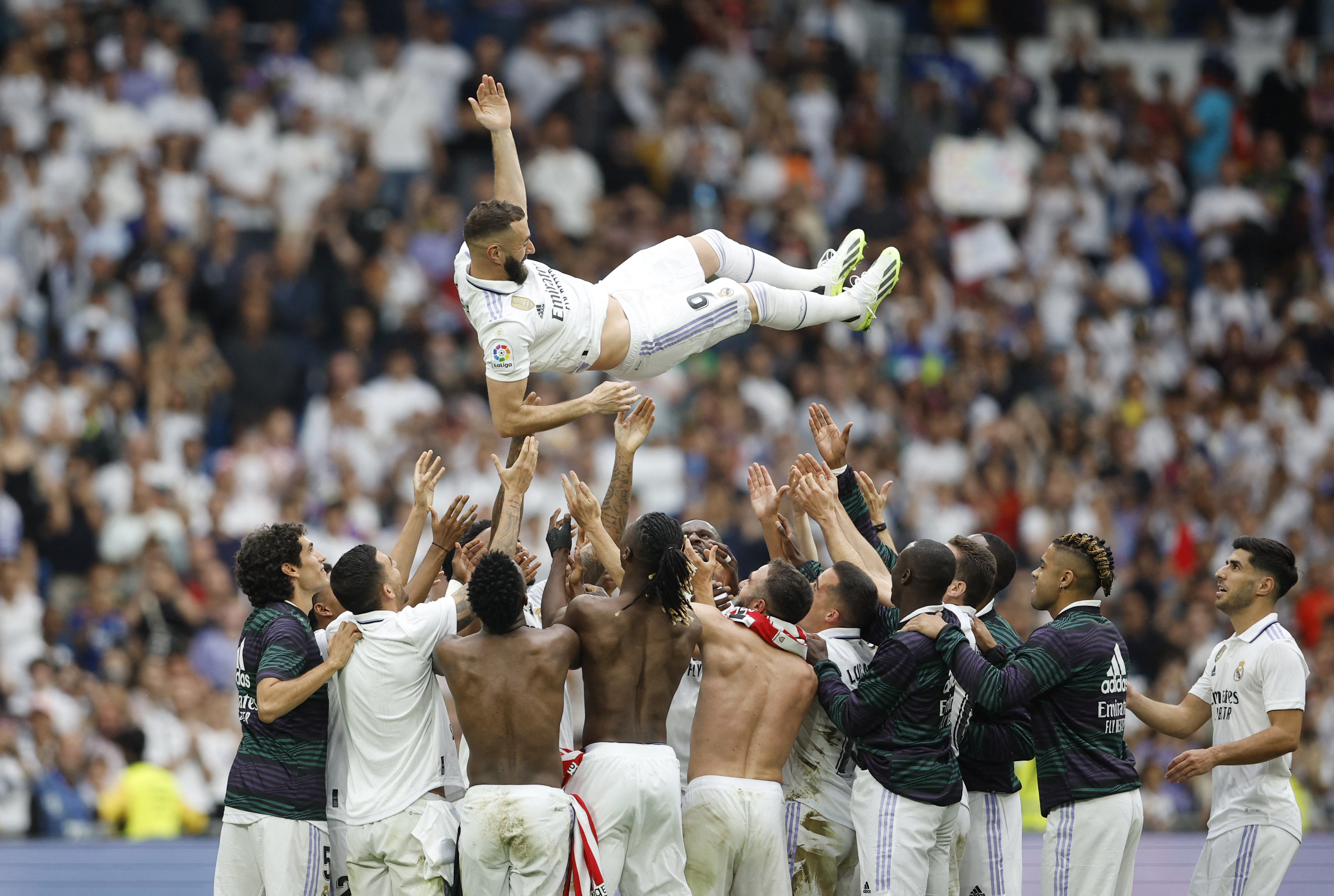 直播吧6月5日讯 西甲第38轮,皇马主场1-1战平毕尔巴鄂,收获联赛第二。赛后,皇马队员先后抛起本泽马、阿森西奥、阿扎尔、马里亚诺,这四名球员将在赛季结束后离开球队。