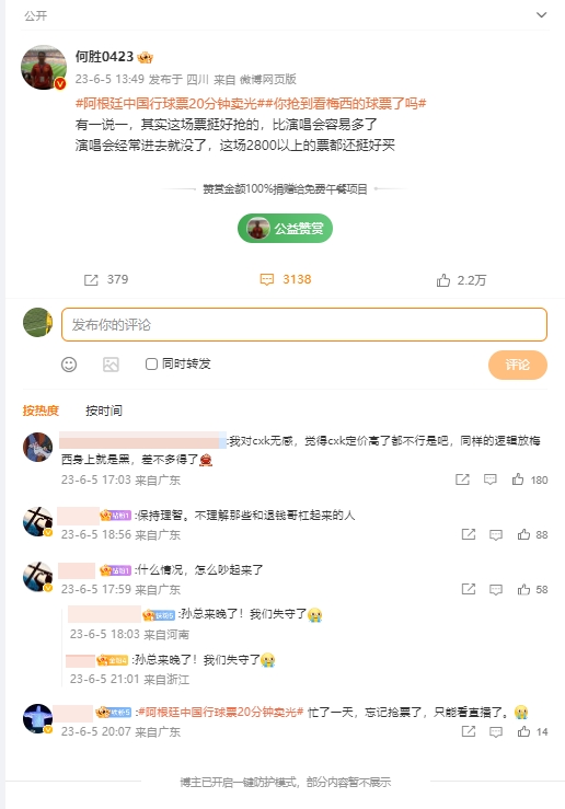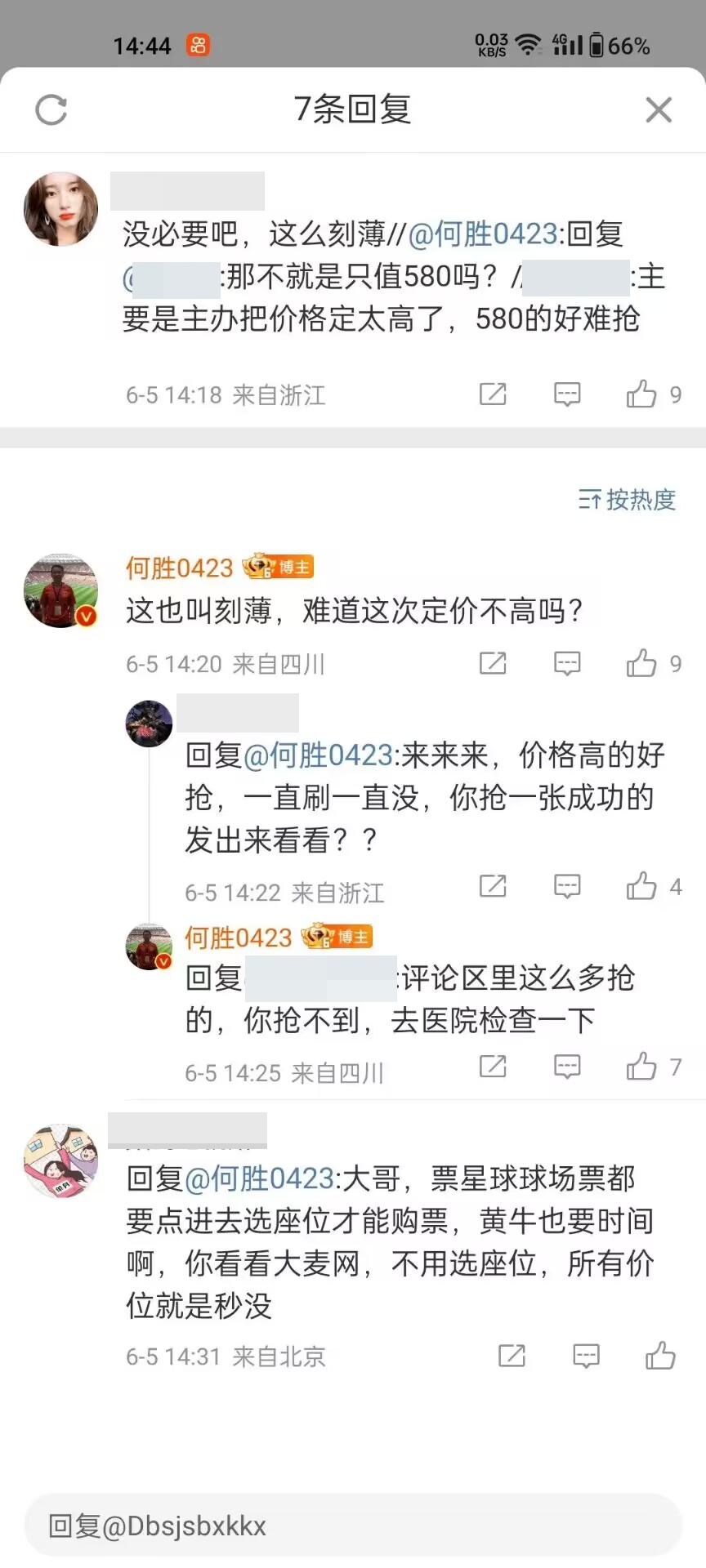 在今天阿根廷中国行第一轮开票后,人称“退钱哥”的何胜在微博评价本次抢票,但某些球迷与他意见不合,起了言语冲突。