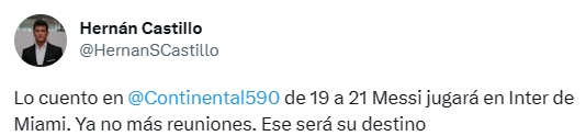 记者Hernán Castillo透露:19-21号梅西将加盟迈阿密国际,不会再有更多的谈判了。