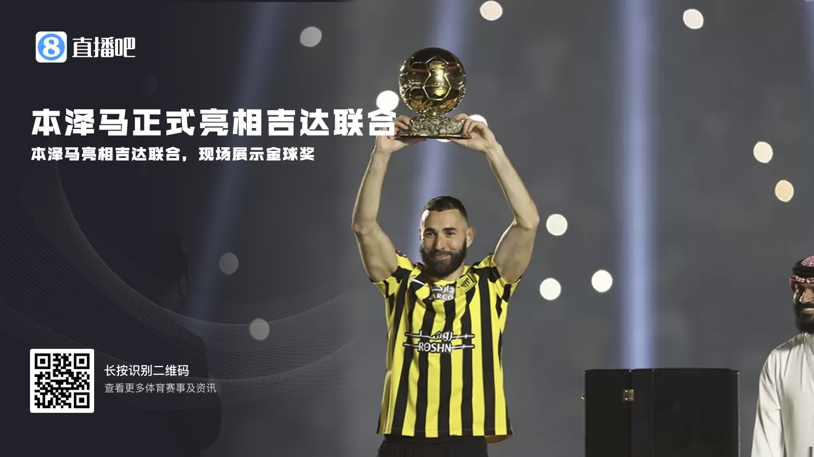 直播吧6月9日讯 本泽马出席了加盟吉达联合后的正式亮相仪式,他在球队主场六万名球迷的见证下现场展示了金球奖。