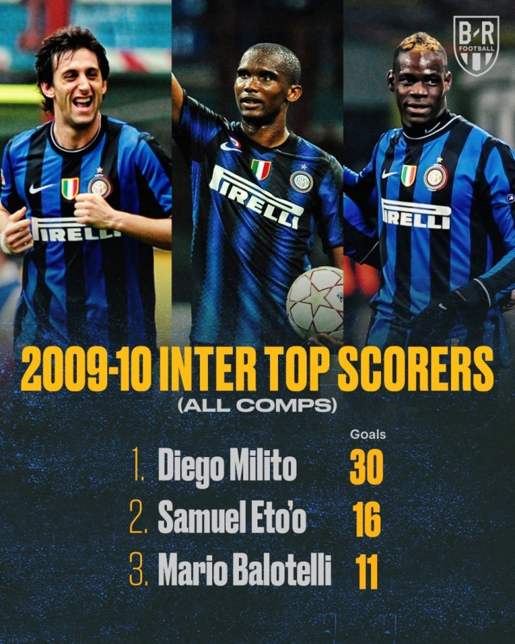 在那个三冠王赛季,米利托30球成为国米射手王,埃托奥16球、巴洛特利11球