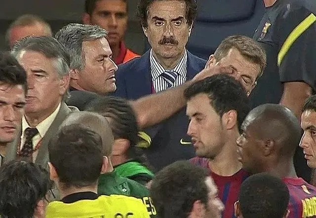 2011年是瓜穆相看的顶峰,除了比赛本身,赛后的唇枪舌剑也让全世界媒体大呼过瘾。那年国家德比一年七战,从西甲到国王杯,又从欧冠到西超杯。超级杯巴萨两回合5-4险胜皇马,双方再次爆发冲突,混乱中,穆里尼奥用手戳了瓜帅助教比拉诺瓦的眼睛,这是穆帅执教生涯的一个污点。