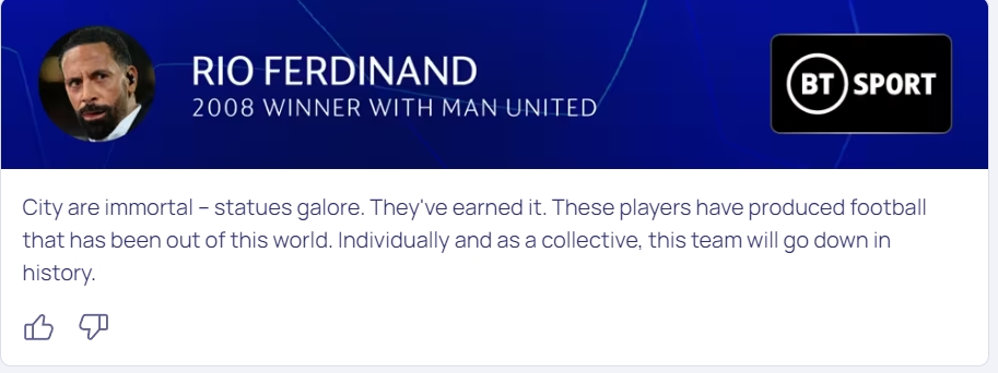 直播吧6月11日讯 2022-23赛季欧冠决赛落幕,凭借罗德里的破门,曼城1-0击败国米,夺得队史首座欧冠奖杯。赛后,曼联名宿费迪南德对曼城的表现给出了极高的评价。
