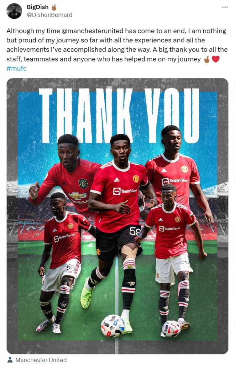 伯纳德写道:虽然我的曼联时光已经结束,但我为过去的这段旅程、一路的经历以及取得的成就感到骄傲。非常感谢所有球队的工作人员、队友以及在旅途中帮助过我的人。