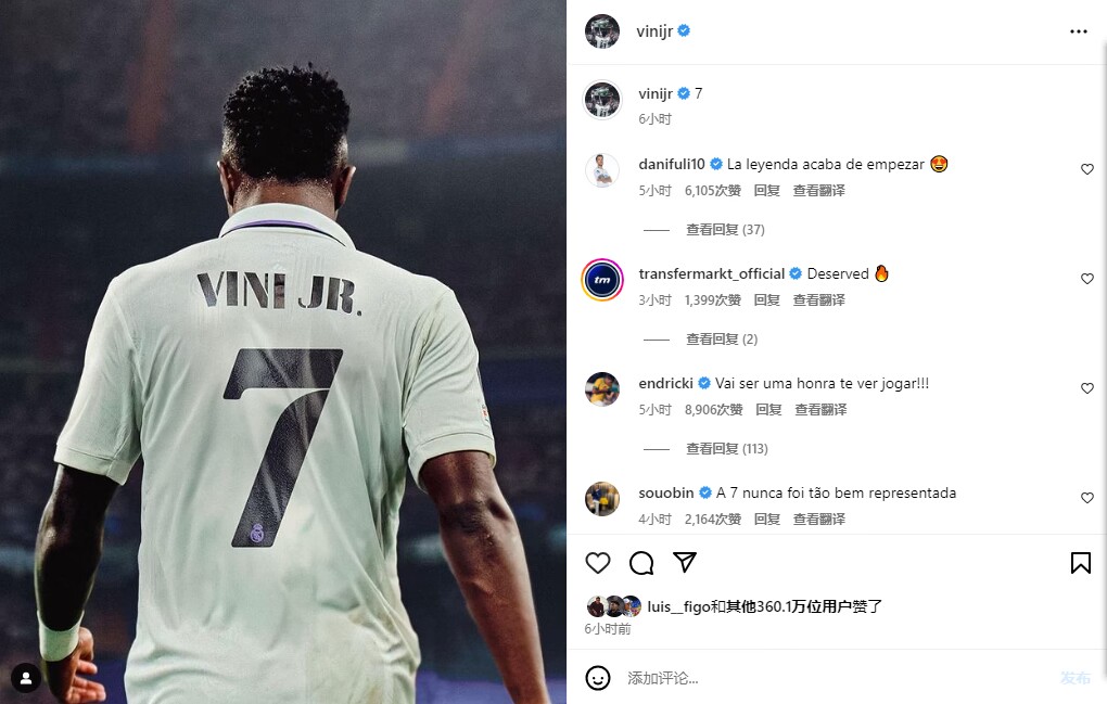 直播吧6月13日讯 皇马此前官宣维尼修斯新赛季将改穿7号球衣,球衣社交媒体发文晒出身披7号球衣的P图。