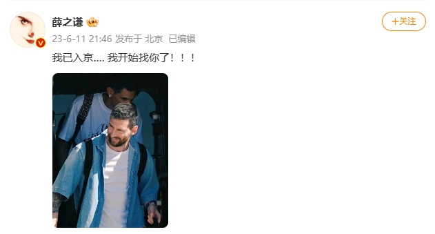 直播吧6月13日讯 6月11日,薛之谦晒梅西照,表示自己到达北京,开始找梅西了。