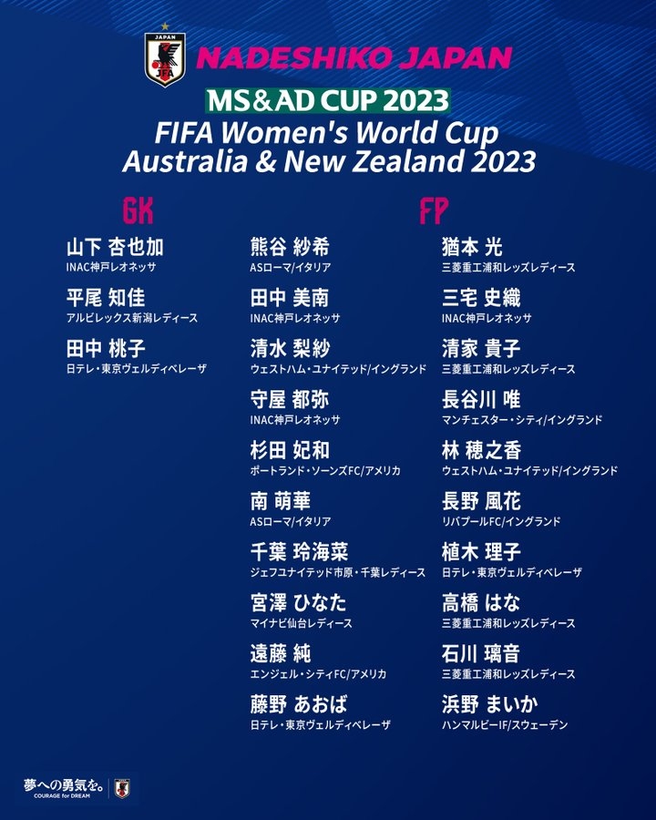 其他球员:熊谷纱希(罗马)、犹本光、田中美南、三宅史织、清水梨纱(西汉姆)、清家贵子、守屋都弥、长谷川唯(曼城)、杉田妃和(波特兰荆棘)、林穂之香(西汉姆)、南萌华(罗马)、长野风花(利物浦)、千叶玲海菜、植木理子、宫泽雏田、高桥花、远藤纯(天使城FC)、石川璃音、藤野青叶、滨野真香(瑞典哈马比)