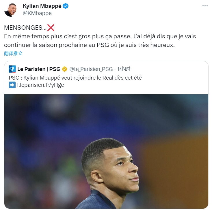 姆巴佩写道:“谎言❌。