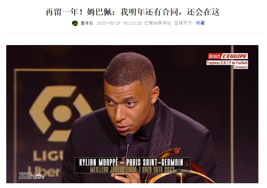 5月29日,在法甲年度颁奖典礼上,姆巴佩连续第4次当选法甲赛季最佳球员,颁奖仪式上他表示自己明年会继续留在巴黎。