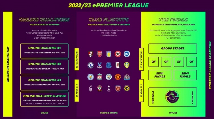 每个英超俱乐部将自行举行各自的俱乐部季后赛,时间从11月底到来年的1月,最终有两名球员,代表俱乐部参加三月的总决赛。在这一阶段,比赛通常会安排在没有英超比赛的时间,同时俱乐部会举办各种线上线下的观赛活动,吸引新一代的球迷。俱乐部还会在自家的主场外设置电子竞技宣传摊位让更多的球迷体验电子竞技,让更多球迷体验或者在未来为自己喜爱的俱乐部效力。