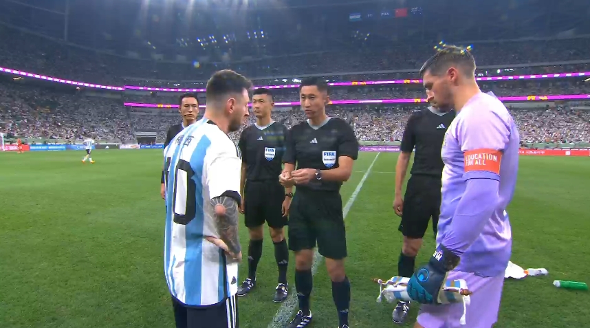 直播吧6月15日讯 阿根廷vs澳大利亚的友谊赛即将打响,赛前,以马宁为首的中国裁判组,引导阿根廷队长梅西和澳大利亚队长瑞安挑边。