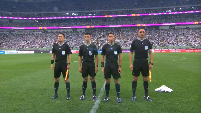 >马宁为首的中国裁判组,赛前引导梅西和瑞安挑边