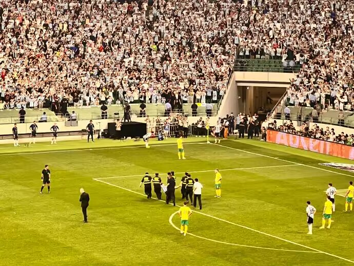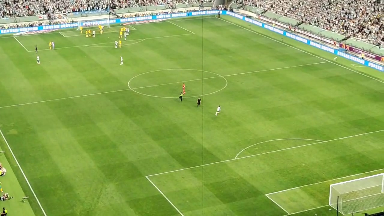 直播吧6月15日讯 阿根廷vs澳大利亚第61分钟,比赛现场有球迷冲了进来!比赛因此中断!根据其他角度看,冲进球场后这位球迷已经抱到了梅西,随后被保安追逐,然后带着幸福地微笑被抬下!