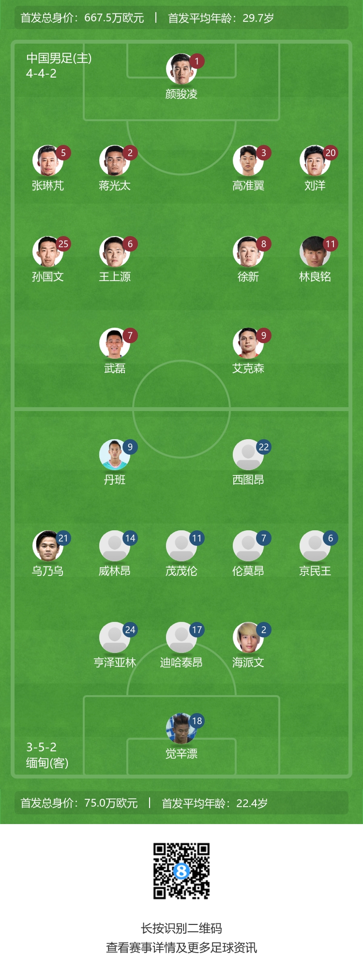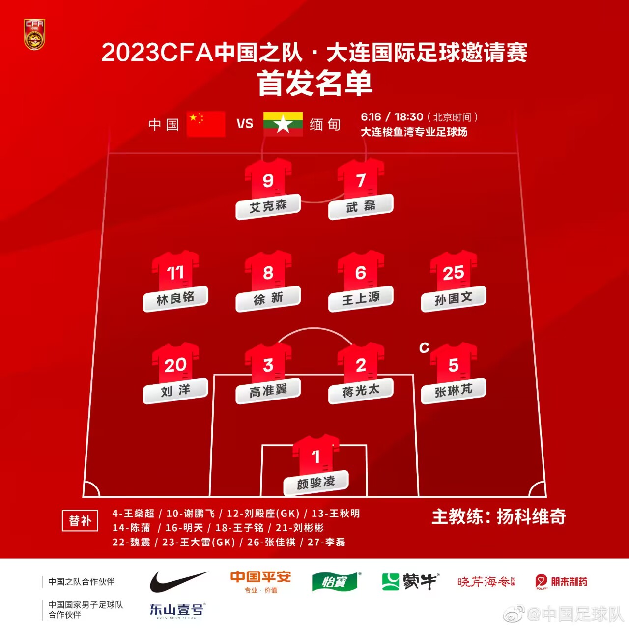 直播吧6月16日讯 北京时间18点30分,中国男足将在大连梭鱼湾体育场迎战缅甸男足,双方首发已公布。