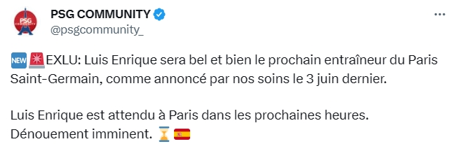 巴黎知名球迷号PSG COMMUNITY独家消息,路易斯-恩里克将成为巴黎圣日耳曼的下一任主帅。预计,恩里克将在几小时内抵达巴黎。