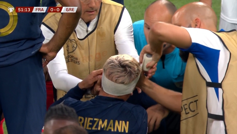 直播吧6月20日讯 欧预赛小组赛第4轮,法国主场对阵希腊,比赛第49分钟,马夫罗帕诺斯飞踹格列兹曼面部,格子面部流血接受治疗,主裁判拉奥斯判罚黄点套餐,VAR介入后未改判红牌。姆巴佩第一次主罚点球被扑出,VAR介入确认希腊球员提前进禁区,点球重罚,随后姆巴佩点射破门,法国1-0领先希腊。
