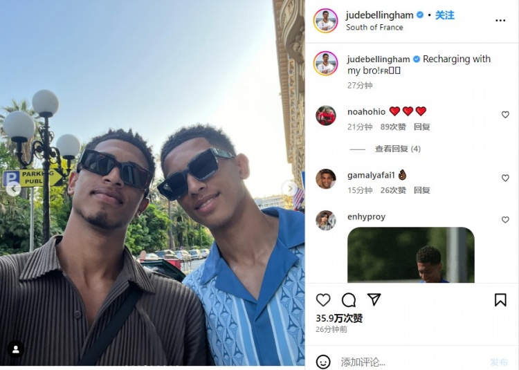 直播吧6月20日讯 皇马新援裘德-贝林厄姆今天在Instagram晒照,与弟弟乔布-贝林厄姆一起度假放松。