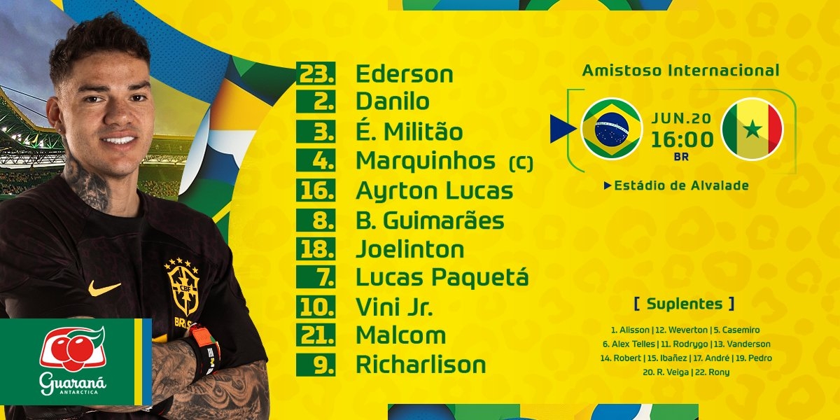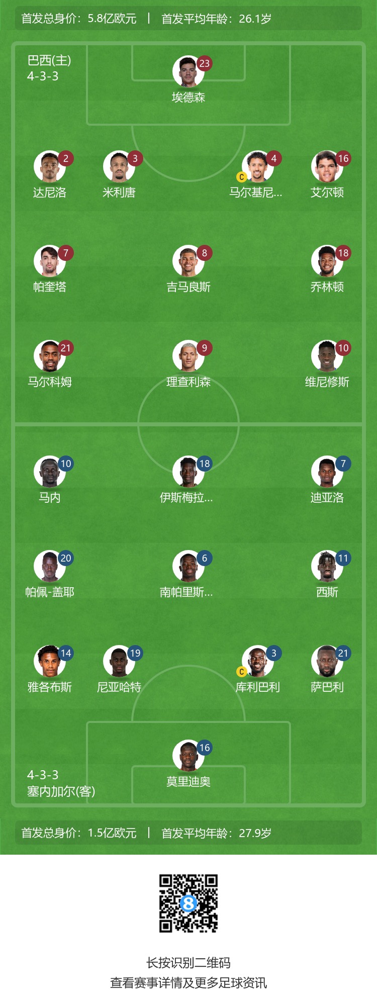 巴西首发:23-埃德森、2-达尼洛、3-米利唐、4-马尔基尼奥斯、16-艾尔顿-卢卡斯、8-吉马良斯、18-乔林顿、7-帕奎塔、10-维尼修斯、21-马尔科姆、9-理查利森