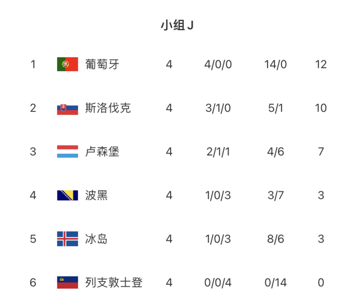 直播吧6月21日讯 欧预赛J组第四轮,葡萄牙击败冰岛,葡萄牙开赛以来四战全胜,进14球丢0球!目前在J组,葡萄牙以12分领跑。
