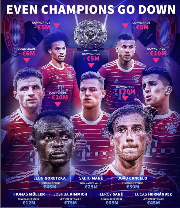 直播吧6月23日讯 《转会市场》更新了德甲球员身价情况,拜仁阵中有7位球员身价下降,其中马内和格雷茨卡各降低了2000万欧元。