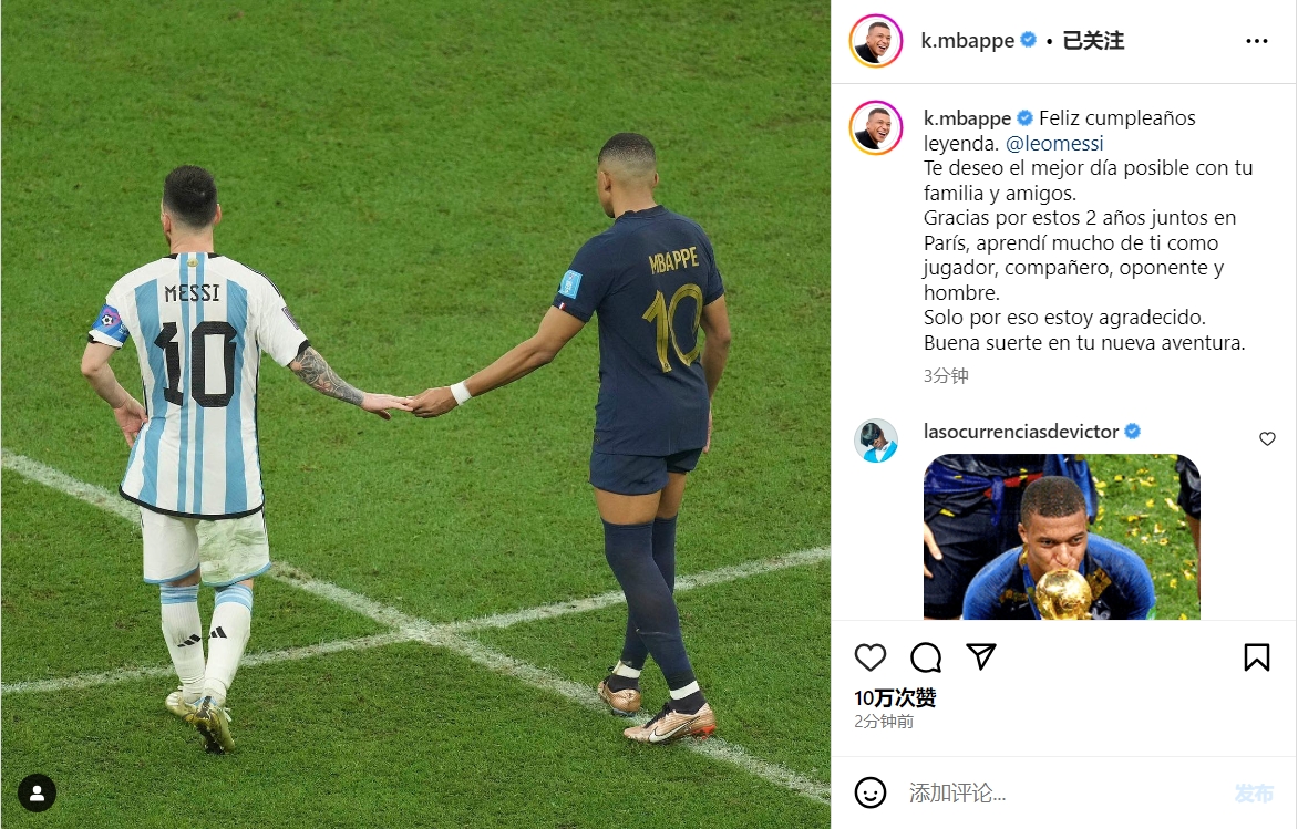 值得一提的是,姆巴佩用了梅西的母语西班牙语发文。