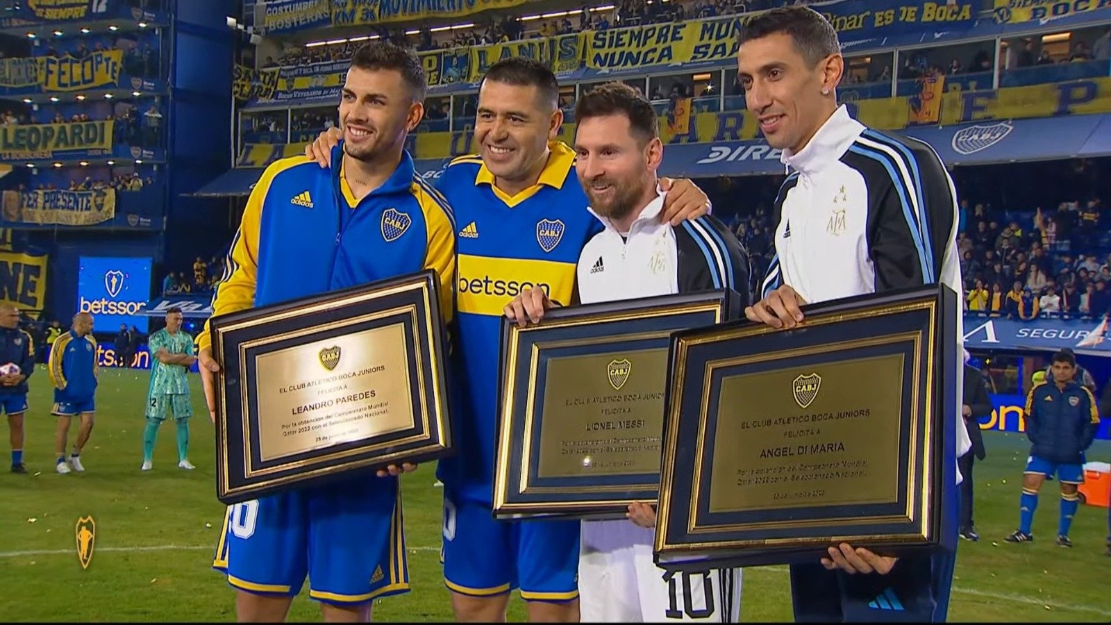 梅西、迪马利亚、帕雷德斯参加了里克尔梅的退役告别赛,而为了表彰他们问鼎2022年卡塔尔世界杯,博卡青年向他们颁发了纪念奖牌。