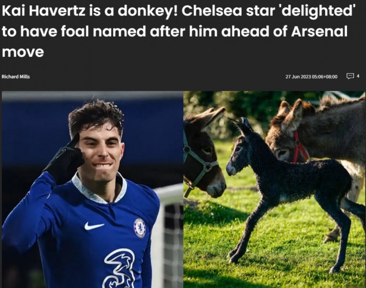 直播吧6月27日讯 最近英国的驴保护组织“驴庇护所”将一头刚出生的小驴命名为“哈弗茨”,球员得知后表示自己很开心。