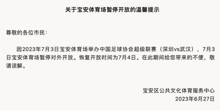 7月3日深圳队主场对阵武汉三镇的比赛,届时将放在宝安体育场举办。