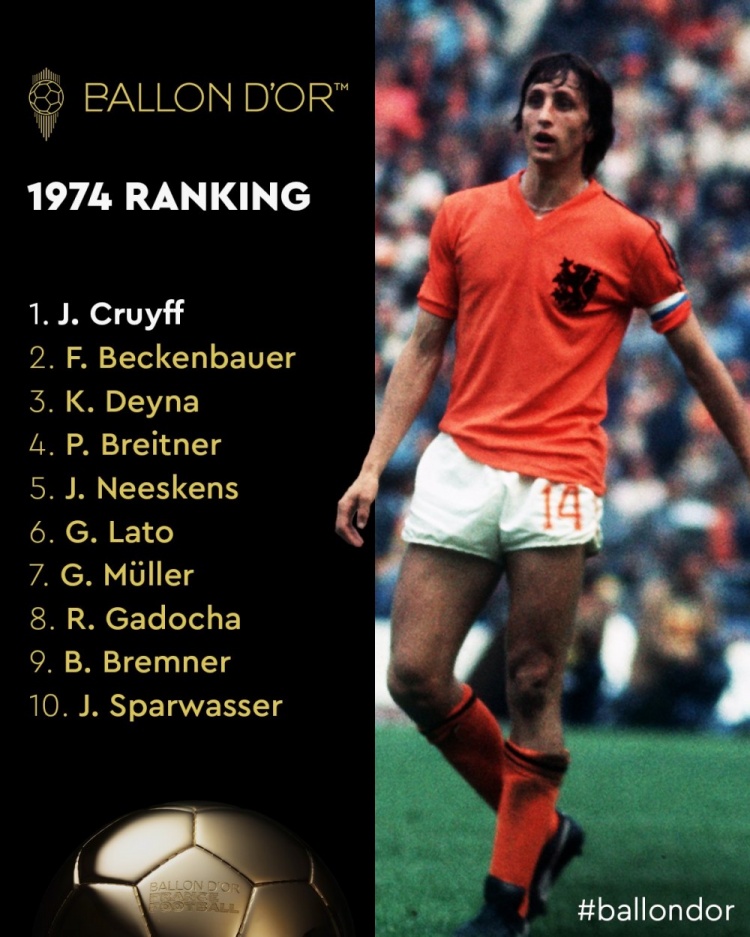 直播吧6月30日讯 法国金球奖官方社媒回顾1974年金球奖排名,克鲁伊夫、贝肯鲍尔前二。