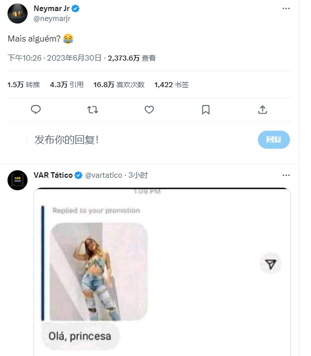 内马尔社媒对此进行了评论:“还有其他人吗?😂”