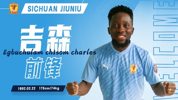 四川九牛足球俱乐部今日宣布,球员吉森(Egbuchulam chisom charles)正式转会加盟四川九牛,他将身披26号球衣为球队出战!