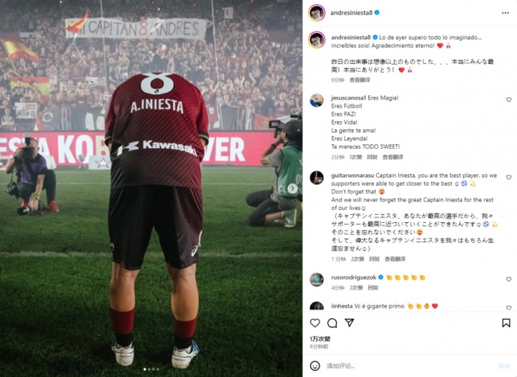 神户胜利船在这条社媒下用西语评论道:“谢谢你,伊涅斯塔!”波多尔斯基、克鲁伊维特、槙野智章等也在这条社媒下留言点赞。