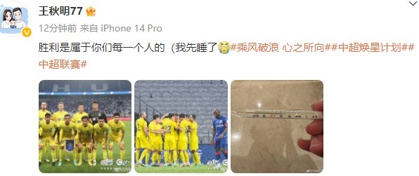 直播吧7月2日讯 中超联赛第14轮,天津津门虎2-1上海申花,天津津门虎本赛季14轮不败。赛后,天津津门虎球员王秋明在社媒晒比赛照片和测量体温的照片,并配文:胜利是属于你们每一个人的,我先睡了。