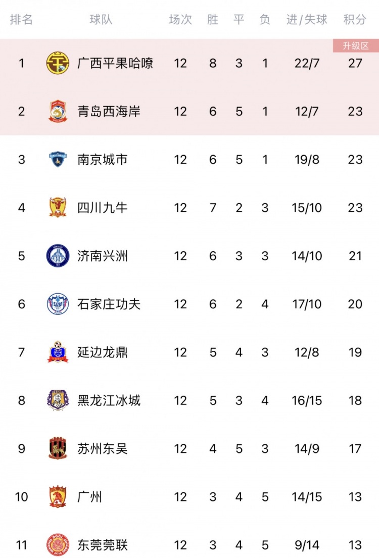 直播吧7月2日讯 今天进行了中甲第11轮5场比赛,南京城市击败济南兴洲,积分追平了第二名的青岛西海岸。延边龙鼎主场击败辽宁沈阳城市,本赛季继续保持主场不败。