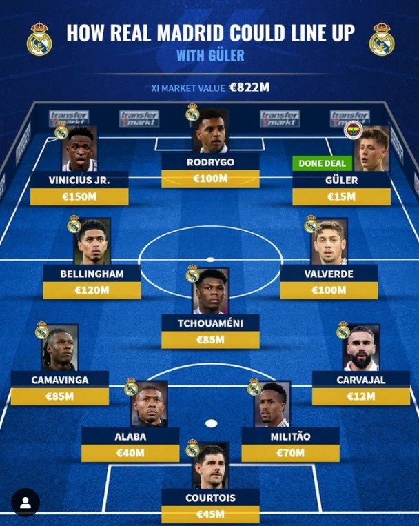 直播吧7月6日讯 德国转会市场网社交媒体预测皇马新赛季首发阵容,新援居勒尔、贝林厄姆在列,卡马文加左后卫,首发总身价达到8.22亿欧元。